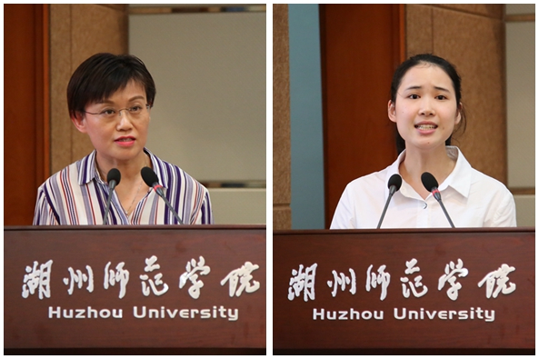 浙江省高校中青年学科带头人、浙江省第二批“千名好支书”、第四届“陆增镛教师奖”获得者理学院毛俊雯教授作为教师代表发言,表示要以习近平总书记提出的“四有”好老师为标准,孜孜不倦、开拓创新,以立德树人为己任,用心关爱学生,呵护学生健康成长,用行动创造新业绩,与师院共发展,将“明体达用”的“湖学”精髓一代代传承下去。