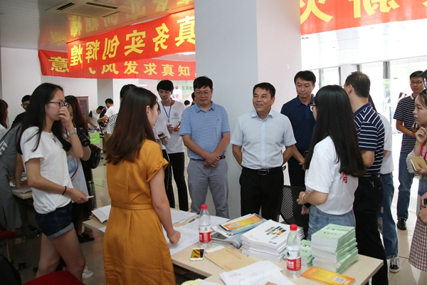 随后,领导们先后前往五个新生报到注册点,对辛勤工作在第一线的老师和同学们表示慰问,详细了解新生报到情况,并不时与前来报到的新生及家长握手、交谈。在E区教学楼7-103报到注册点,张立钦走进家长等候区,与一位家长交流起来,“从哪里来?报到还顺利吗?”,“恩,很顺利,学校安排的很周到,接待人员都很热情,感谢学校的细致安排”。 “选择求真学院,请你们放心!”临走前,张立钦语重心长地说道。