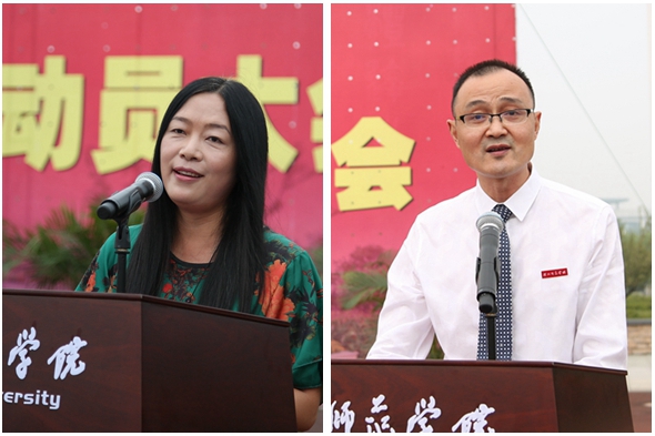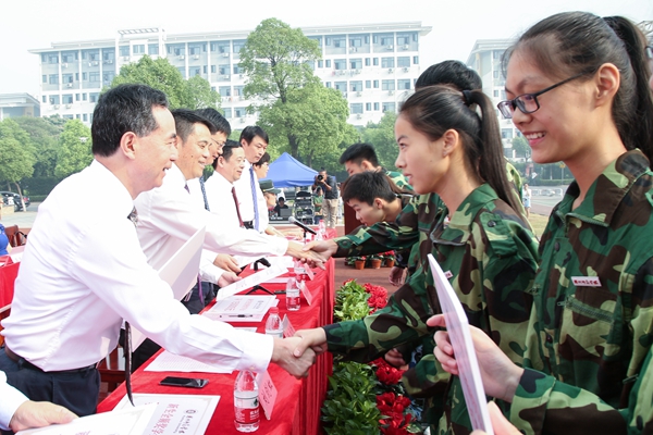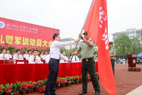 在军训动员大会上,刘剑虹代表学校向军训团授旗。