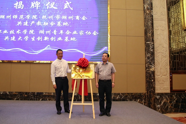 比赛结束后,举行了共建基地揭牌和创新创业基金成立签约仪式,我校与杭州市湖州商会共建产教融合基地,德信控股集团出资500万设立“德信湖州师范学院师生创新创业基金”,专项用于湖州师范学院(含求真学院)师生创新创业项目的天使投资。这是继杭州市湖州商会副会长、富尔顿中国有限公司执行总裁陈健在我校捐赠设立500万“陈健大学生创新创业基金”后,杭州市湖州商会对我校创新创业工作的再次资助。产教融合基地的共建,也将进一步推动我校与杭州市湖州商会企业发挥各自资源优势,深化校企合作,实现产教融合共赢。