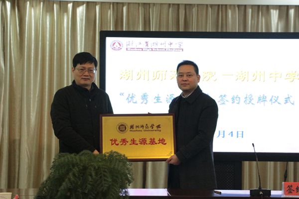 近日,我校与湖州中学签署“优秀生源基地”合作协议,校党委副书记蒋云良代表学校向湖州中学授予“湖州师范学院优秀生源基地”铜牌,招生就业处、体育学院相关负责人及湖州中学相关领导参加签约仪式。这是继与嘉兴一中签约后再次与首批省一级重点中学签订合作协议。