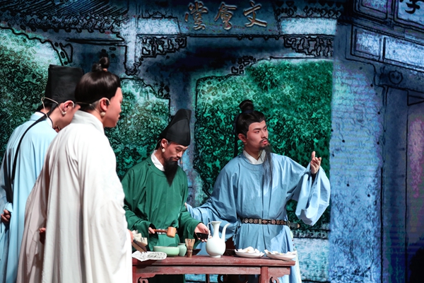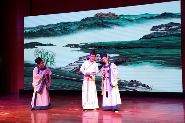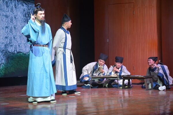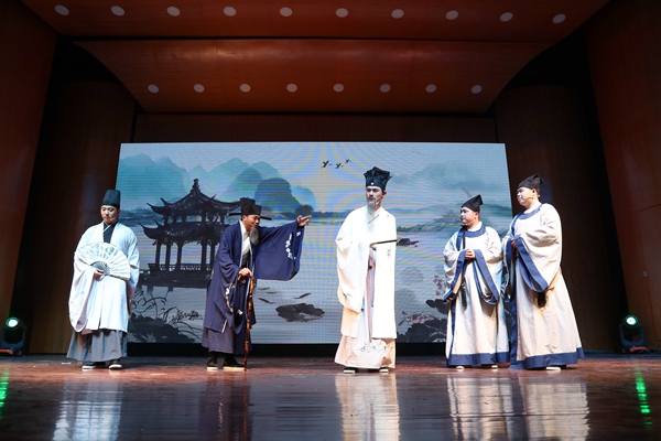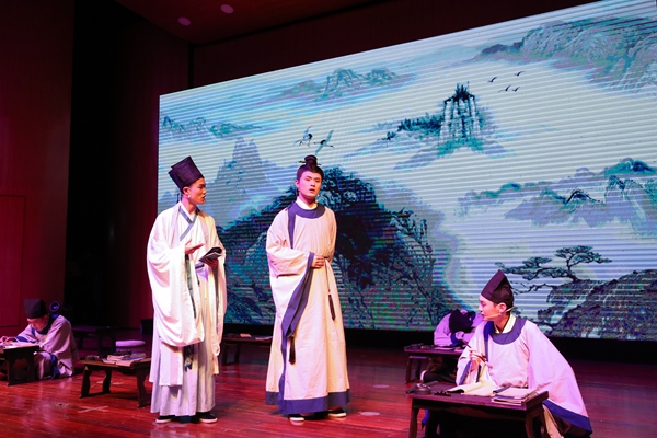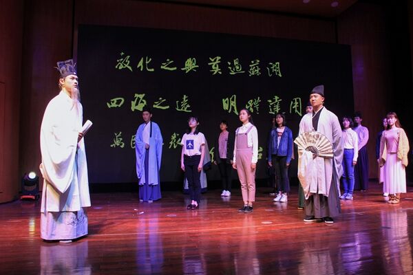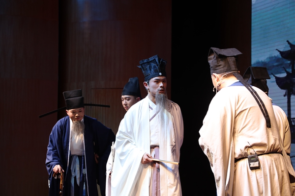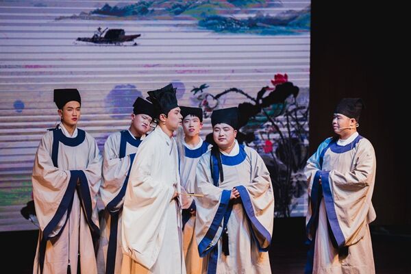 话剧《君子胡瑗》讲述了胡瑗先生一生求学和教学的故事。整场话剧一共分为四幕,以说书人的念白引出胡瑗先生一生的四个重要阶段。第一幕中,胡瑗从小读书勤奋、好学上进,但未受过良好的教育,其父深知无力再继续教育,便将他“赶出家门”,外出求学;第二幕讲述胡瑗来到山东泰山栖真观求学深造,潜心学习,钻研学问,10年不归家;第三幕讲述胡瑗学成归来,开书院授课,在湖州实行“分斋教学法”,主张“明体达用”的思想;第四幕,晚年的胡瑗即将告老还乡,带领学生游湖,与学生依依不舍,展现出浓厚的师生情谊。真实而生动的求学故事,通俗而有趣的生活场景,这段跨越千年的历史被13位演员演绎得淋漓尽致。四百人的音乐厅内座无虚席,不时从座位上传来观众的笑声和掌声,直到演出结束,观众还深深地沉浸在剧中,意犹未尽。来自文学院的乔滢煦说道:“第三幕的对比形式让我印象最深,胡瑗看到不认真上课的学生,没有去批评他们,还去和学生玩投壶,发现学生的特长,再采取分斋教学的方式教育学生。”