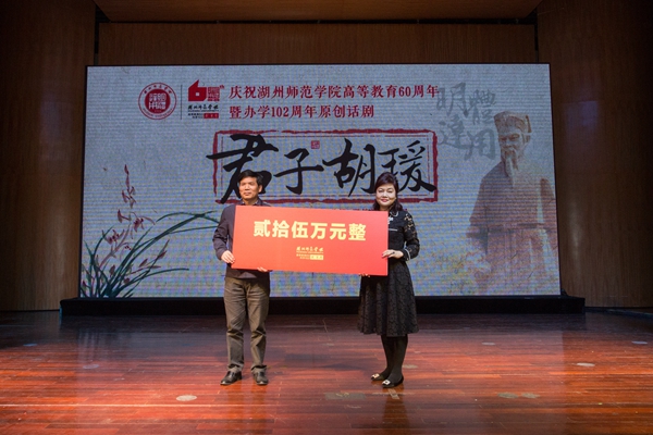 “教育之兴,莫过苏湖。四海之远,万民之众。经义治事,明体达用”随着舞台的灯光慢慢亮起,演员与群演们齐声朗诵“明体达用”的校训一起走上台前,胡瑗先生的故事在师院的舞台上首次上演。4月18日晚,由校党委宣传部、湖州市文广新局主办,文学院启明剧社承办的原创话剧《君子胡瑗》在我校音乐厅首演。副市长闵云,校党委书记刘剑虹,党委副书记黄建平、蒋云良,副校长陈亚明,党委委员、宣传部长杜宁,市文广新局党委副书记、副局长许建跃,以及胡瑗先生的后人——世界中华宁波总商会副会长、美国中华宁波总商会会长胡运熹出席,相关职能部门、各二级学院负责人与全校师生一起观看整场演出。