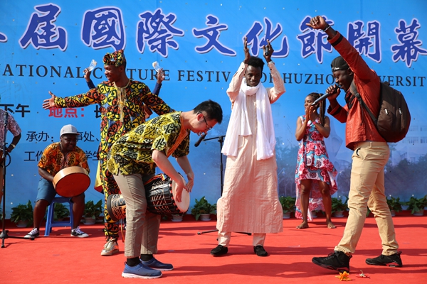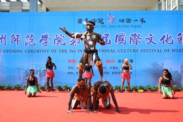 接着,由中外学生联合编排的开幕式演出正式开始。来自俄罗斯、乌兹别克斯坦、乌克兰、孟加拉国、埃塞俄比亚、卢旺达等20多个国家的留学生身着民族服装闪亮登场,迅速吸引了全场眼球;来自俄罗斯的留学生带着朝气蓬勃的舞姿,为全场观众带来震撼;来自非洲卢旺达、津巴布韦、埃塞俄比亚的留学生带来的非洲民族舞和非洲手鼓更是给现场观众带来了视觉和听觉的双重盛宴;来自孟加拉的留学生带来的民族舞蹈和歌曲给我们带来了不同的文化体验。