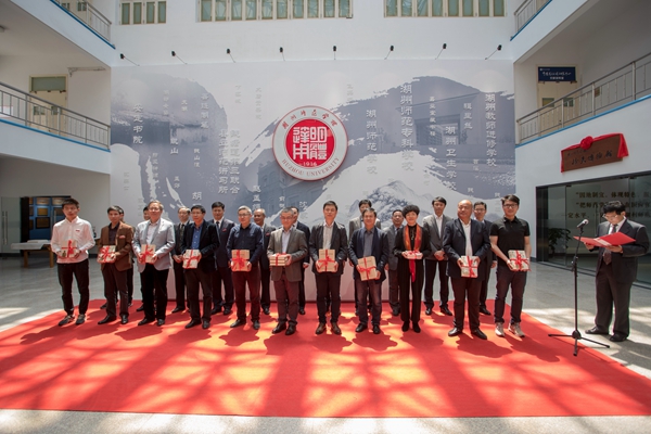 校领导刘剑虹、张立钦、蒋云良、叶金云、朱鸿、马志和、陈亚明,老领导蔡清江、胡璋剑,《湖州师范学院校史资料选编》组长李学功和《粉笔生涯》整理者杨心珉老师向师生代表赠送《湖州师范学院校史资料选编》《湖师旧事》《粉笔生涯》。