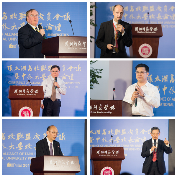立德树人,铸师范之魂;明体达用,追大学之梦。4月21日下午,我校庆祝高等教育60周年暨办学102周年压轴活动之一——环太湖高校联盟成员会议暨中外大学校长论坛在东校区图书馆8楼报告厅顺利举办。浙江省教育厅副厅长于永明,湖州市委副书记、环太湖高校联盟顾问陈浩,湖州市副市长闵云出席,环太湖高校联盟理事单位和美国北科罗拉多大学、英国切斯特大学、德国维尔茨堡应用科技大学、阿塞拜疆语言大学、乌克兰敖德萨国立理工大学、香港浸会大学、台湾中原大学等23所高校领导,旅美作家胡为美,湖州市校地合作办、人才办、发改委、经信委、人力资源社会保障局、教育局、科技局等相关负责人,以及我校各职能部门、二级学院负责人共计90余人参加了会议。会议分为环太湖高校联盟成员会议和中外大学校长论坛两个阶段。