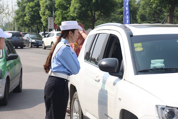 除此之外,女警中队的队员也投入到迎新工作中来。学校主要道路设有站岗点,队员们身着统一的制服,挺拔端正的身姿颇有巾帼风范。教师教育学院大三的王敏同学介绍说:“我们的主要工作是疏导交通,告诉外来车辆不能乱停车。我们也会为新生解答问题,告诉他们应该去哪里注册。”