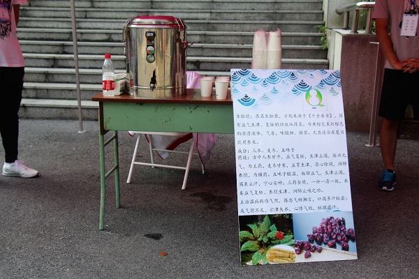 “救疾恤患慎独奉献 做德艺双馨医学生”。医学院的岐黄社为迎新制作了“生脉饮”,这是成分为人参、麦冬、五味子的养生凉茶,在学院门口,每一位报道的新生及家长都可以饮用。红十字急救会的志愿者在遮阳棚里就摆了医用人体模型,可以现场教学学生和家长常用的急救知识。