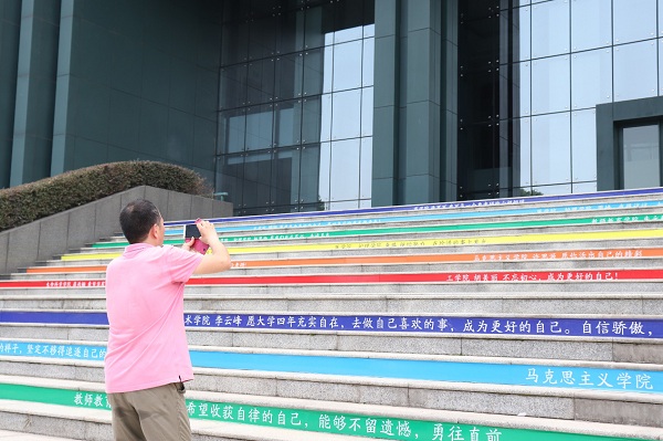 作为学校标志性的建筑物之一,大会堂也在迎新当日化上了新妆。“愿大学四年充实自在,去做自己喜欢的事,成为更好的自己。自信骄傲,少些遗憾。”来自师院小萌新们的大学畅想,被配上了五颜六色的背景纸,贴在了大会堂的阶梯上,见证着新生们的成长。