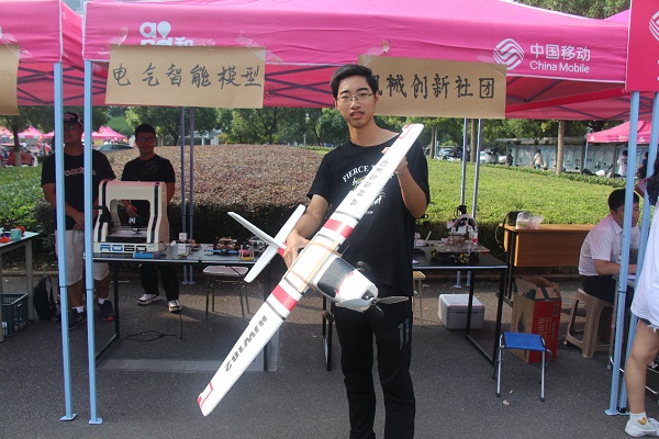 而工学院机械创新创业社团则使用了社团的镇社之宝——飞狐无人机,在迎新学长们精湛的航模操作下也吸引了大批新生驻足。一位新生在与操作航模学长交流后,就已经能尝试操控航模,为工学生们强大的动手能力点赞。