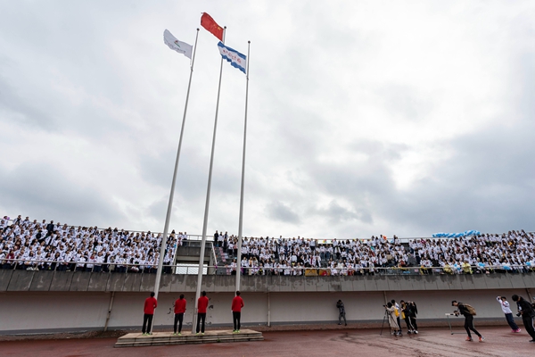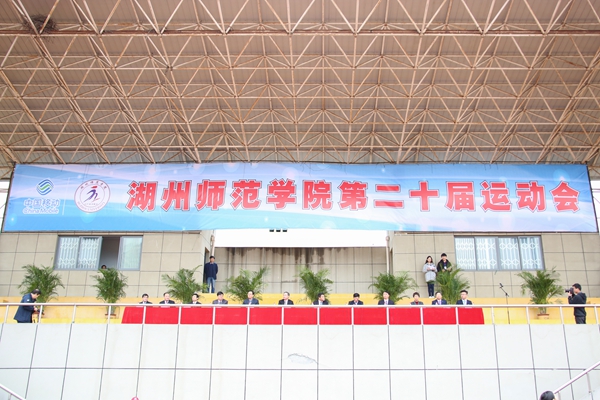 在全校师生的起立注目下,国旗、第二十届运动会会旗和湖州师范学院校旗依次冉冉升起。