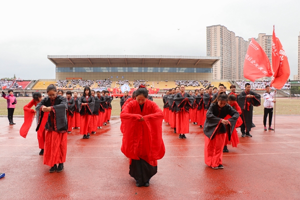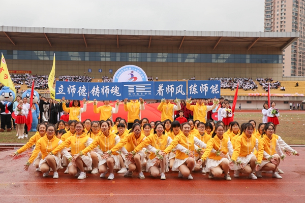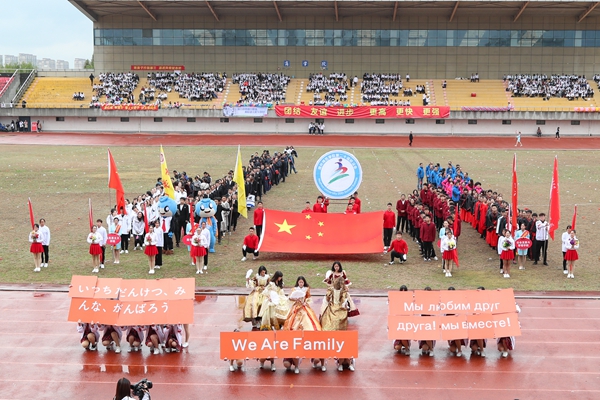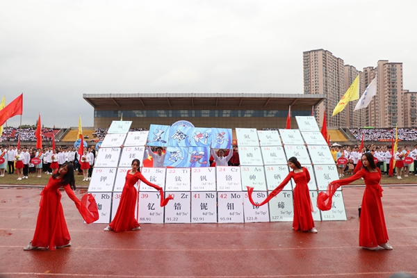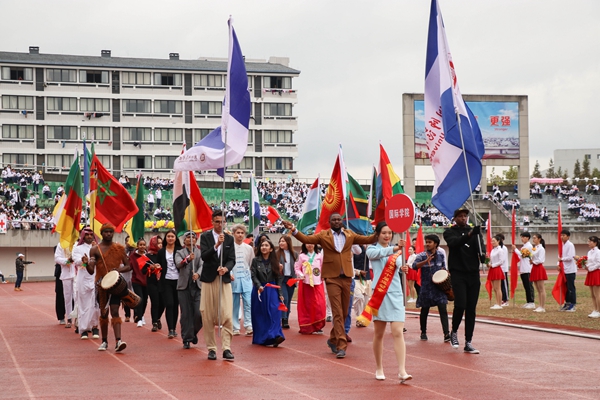 各代表队队列方阵依次走来,向师生们展现了她们的靓丽风采。商学院代表队携吉祥物商宝一同亮相,秉持着“讲信修睦,经世济民”的院铭,展现了敢为人先,斗志昂扬的商院风采;社会发展学院代表队身着汉服,英姿飒爽,尽显青春蓬勃的朝气;马克思主义学院秉承“明德善政,崇真达治”的院铭,思政教育的魅力在他们的身上尽显;教师教育学院啦啦队方阵身着亮丽的服装,演散发着新时代大学生的青春活力。整齐的着装与饱满的精神,诠释着“学高为师,身正为范”的教师法则;文学院代表队身着汉服,广袖蹁跹,俯首作揖一气呵成,展现了文院骄子的非凡气度;外国语学院方阵队形变换多样,“We are family!”以英日俄三种语言呈现,朝气与活力从每一个队员身上散发;艺术学院方阵队变换KT板组成“艺”字,“相亲相爱,自成一脉”的口号尽显蓬勃朝气、奋发精神;理学院方阵队喊出铿锵有力的口号,展现坚韧顽强的精神和青春的热情;信息工程学院方阵队变换队形,齐头并进,精神饱满的斗志展现出全体师生的良好风貌;工学院方阵队身着工装,他们秉承“笃学崇工,厚德尚用”的院铭,飞机表演和方阵舞蹈尽显了工学院师生的无限动力;生命科学学院方阵队将多种化学元素在队形变换中呈现,翻转后组成海洋的画面,展现了旺盛的生命活力和不懈的求知精神;医学院•护理学院代表队提着医疗箱,推着治疗车,高呼着“救急恤患,慎独奉献;追求卓越,誉满杏林”的口号,彰显着医学生的责任与担当;继续教育学院啦啦队精彩的体操表演吸引了观众的目光;国际学院的留学生们身着各民族特色服饰,中西结合的表演方式给场地带来了别样的色彩,太极表演更是赢得了在场观众的阵阵掌声。求真学院方阵整齐划一的步伐吸引目光,把团结一致勇敢拼搏的精神体现得淋漓尽致。
