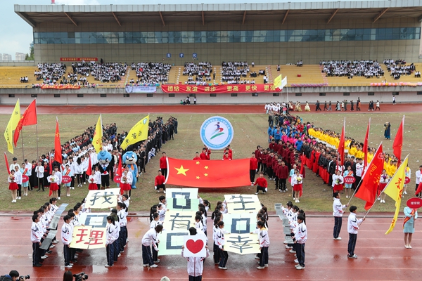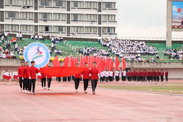 入场式伴随着雄壮的运动员进行曲开始,国旗手、校运动会会徽队、花束队、彩旗队以及全体裁判员、运动员迈着整齐的步伐,精神饱满地步入运动场。