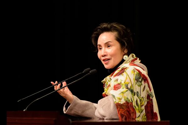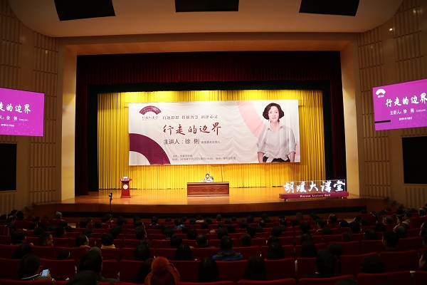 讲座一开始,徐俐就以幽默诙谐的语气调侃道自己是个斜杆中年,同时一股字正腔圆的播音腔,引得了全场掌声雷动。徐俐指出,“其实行走呢,既是物理意义上双脚的走来走去,当然也有精神和思想意义上的行走。而我为什么讲到‘边界’这个词,其实就是活在这世上你打算走多远,走多宽。其实你是不知道边界在什么地方的,你只有实实在在去走,用你的双脚,你在精神层面努力去探寻这个‘边界’,你才会知道你的边界在什么地方。”她回顾自己从业三十多年的经历,从小小长沙市广播站的知青播音员到央视知名主持人,从零开始学习普通话到进入央视的大门,从业务起点低到1992年CCTV四台开播成为呼出台号走向世界的第一人。徐俐一直在跨越自己的边界,也十分感恩时代给予的机会。中央电视台平台大、机会多,她自己也学会了如何去学习成长,适应工作对自己的要求,她觉得多年来的成功失败都是一笔宝贵的财富。
