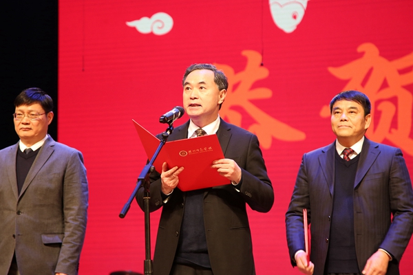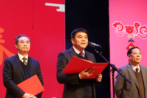 校长张立钦发表致辞。他表示,2018年是我校发展历史上具有里程碑意义的一年。全校上下深入学习贯彻习近平新时代中国特色社会主义思想、党的十九大和全国教育大会精神,紧紧围绕“湖州师范大学”奋斗目标,不断激发干事创业激情,团结拼搏,攻坚克难,各项事业迈上了新台阶。学校准确把握“大有可为的历史机遇”,办成了两大喜事。一是举行了高等教育60周年暨办学102周年盛大庆典;二是国务院学位委员会正式批准我校为硕士学位授予单位。学校坚持从五个方面精准发力,在加快发展、内涵发展、赶超发展的道路上书写了“奋进之笔”。一是坚持高质量发展,人才培养取得新成效;二是坚持协同创新,科研与服务地方能力实现新突破;三是坚持内涵建设,学科与师资队伍建设又有新进展;四是坚持开放办学,对外交流合作呈现新局面;五是坚持党建引领,为学校改革发展注入新动力。2019年学校将开启建设具有优良师范传统、鲜明应用特色的教学研究型大学的新征程。大家要紧紧围绕学校发展的中心任务,立足新起点,继续新征程,凝心聚力、不负众望,力争早日实现“大学梦”。