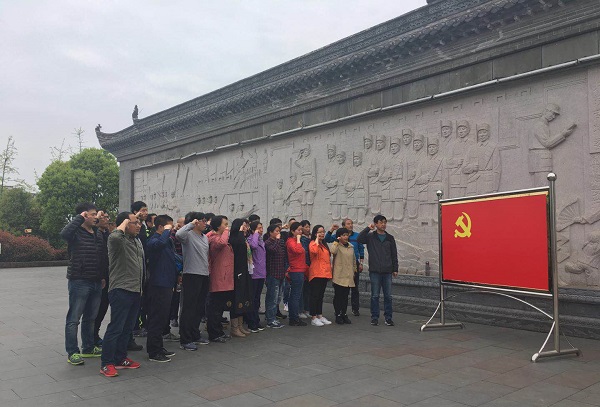 在纪念馆广场,全体党员重温入党誓词仪式。大家面朝照壁浮雕集体肃立,怀着对革命先辈的无限哀思和崇高敬意,向新四军六将领默哀并深深三鞠躬。党员们面对党旗、右手举拳,在院党委书记李雁冰领誓下诵读入党誓词,铿锵有力的声音响彻在广场上。