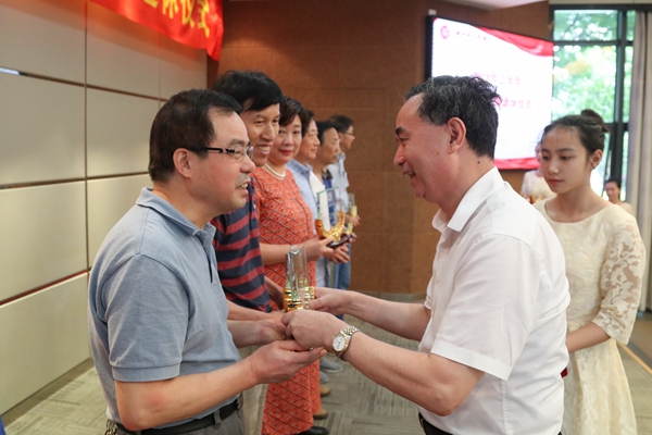 会上,刘剑虹为上半年光荣退休的教职工颁发刻有名字的专属水晶荣休杯。