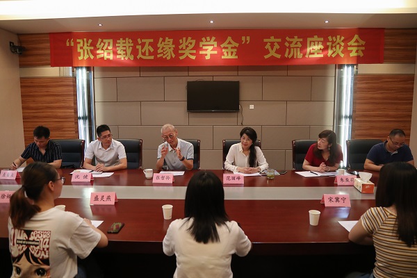 9月11日下午,我校冠名奖学金——“张绍载还缘奖学金”捐赠人,原中国建筑非执行董事,远东环球执行董事、行政总裁及董事会副主席张哲孙先生,在出席2019年“湖州人大会”期间,拨冗来校,与今年获奖学生面对面交流座谈。