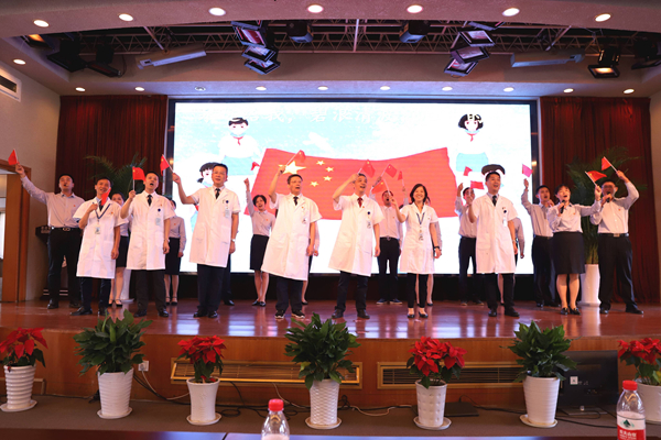 为隆重庆祝建国70周年,鼓励广大员工不忘初心、牢记使命,9月29日下午,湖州市第一人民医院举行了“献礼国庆70周年,奋进医院新时代,医院和祖国共成长”庆祝大会,参加大会的有医院老领导、院领导、退休返聘人员、退管会委员、小组长,原中层退居二线的在职职工、全院中层干部、后备学科带头人、青年英才等人员。