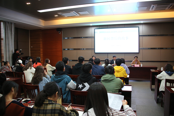 11月13日下午,大学生通讯社专题培训在明达楼230进行。湖州市劳动模范、政协委员、安吉宣传部陈毛应老师作为主讲嘉宾,为大学生通讯社的学生们作了专题讲座《新闻背后的故事》。