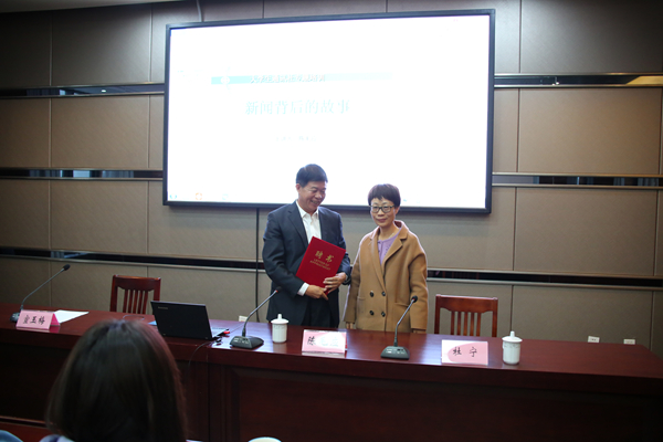 讲座开始前,陈毛应被聘为我校大学生通讯社指导老师,党委委员、宣传部长杜宁为陈毛应颁发了聘书。