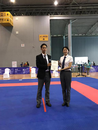 据悉,芦文轩同学大一的时候就被选拔为湖州师范学院跆拳道、空手道校队成员。训练刻苦,运动比赛成绩突出,曾荣获省跆拳道锦标赛赛冠军。在指导老师文善恬副教授的带领和推荐下,2017年在浙江台州以优异的成绩考取国家一级空手道裁判员证。近年来,先后执裁2018年空手道国家队选拔赛、浙江省第十六届运动会空手道比赛、第十八届世界警察与消防员运动会空手道比赛等国内和国际赛事。因其执裁判罚尺度得当,表现突出,多次受到表扬嘉奖,荣获省优秀裁判员荣誉三次。