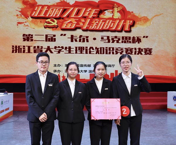11月23日,由浙江省委宣传部、省教育厅共同主办,浙江工商大学、温州大学承办的第二届“卡尔·马克思杯”浙江省大学生理论知识竞赛在浙江工商大学举行,省委宣传部、省教育厅领导和相关处室负责人、入围高校分管领导及入围决赛高校的师生参加了本次活动。我校选手在必答题、时政评论、抢答题、风险题四大环节,凭借充足的赛前准备和丰富的知识储备,从容作答,最终获决赛三等奖。