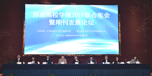 12月5日,苏浙高校学报研究会2019联合年会暨期刊发展论坛在我校召开。此次会议由江苏省高校学报研究会和浙江省高等教育学会高校期刊分会联合主办,湖州师范学院学报编辑部承办。来自苏浙两省160余位高校期刊主编、编辑参加了会议。我校副校长、学报主编叶金云,湖州市委宣传部副部长、市社科联主席沈振建,中国高校科技期刊研究会理事长、北京林业大学期刊主编张铁明出席了会议。会议开幕式分别由我校学报编辑部主任刘东和浙江省高等教育学会高校期刊分会秘书长寿彩丽主持。叶金云、沈振建、张铁明先后致辞。