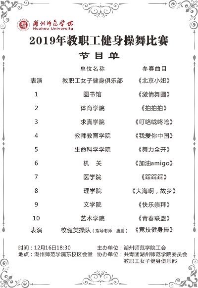 协 办 方:共青团湖州师范学院委员会、教职工女子健身俱乐部