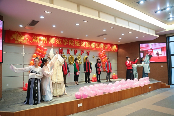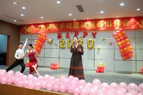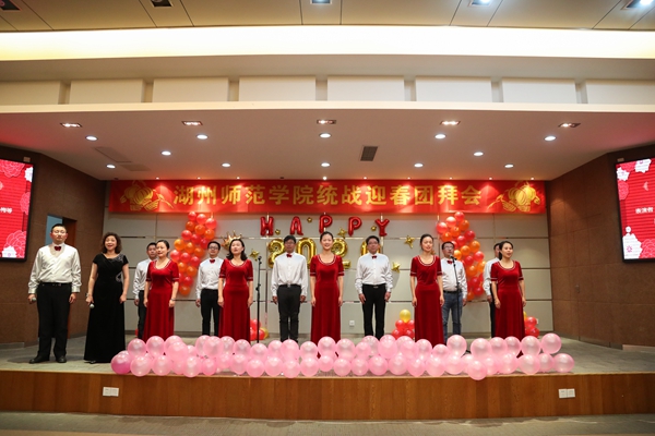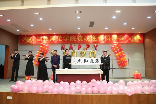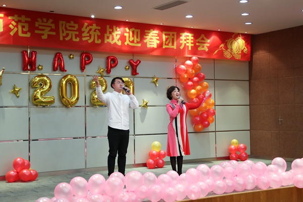 民革师院支部带来的小组唱《我和我的祖国》,充分表达了师院人对祖国的一片赤诚;民盟师院总支选送的配乐书法《藏龙卧虎》,笛声悠扬,翰墨飘香,寓意中华文明源远流长、统战成员人才辈出;民进师院支部选送的歌伴舞《红色高跟鞋》,歌声甜美,舞姿婀娜,把我们带回了为梦想奔波的青春岁月;民建师院支部的诗朗诵《铭记初心》,诠释了披荆斩棘、同心追梦、携手并进的浓浓深情;农工党师院支部选送的二重唱《向往》,旋律大气优美,歌词真挚动人,生动反映了祖国大地的巨变;校知联会带来的男声独唱和书法表演《共和国之恋》,展现了共和国万象更新,表达了党外知识分子对祖国的炽热情感;最后,团拜会在九三学社师院委员会的合唱《不忘初心》中画上了圆满的句号。