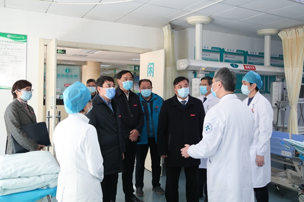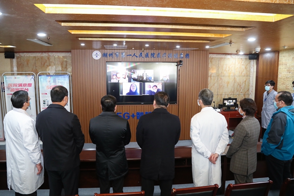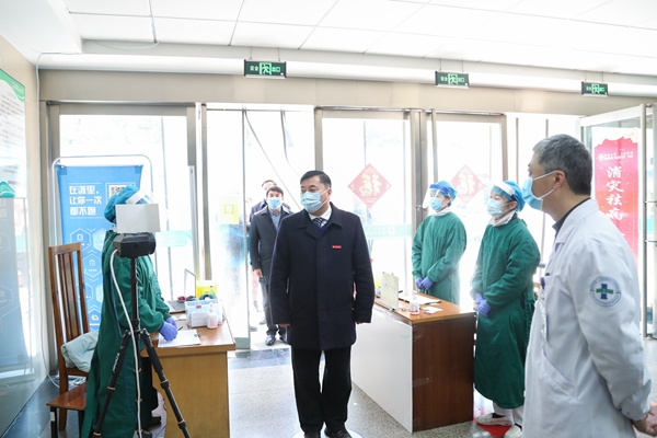 金佩华一行来到附属第一医院以后,先后走访考察了医院的发热门诊、急诊科和行政中心。一路上,附属第一医院相关负责人向金佩华一行介绍了医院的疫情防控措施。在进入医院大门后,所有人都接受了医务人员的“五问一测”。在行政中心,金佩华一行通过视频连线慰问了驰援武汉、温州的医疗队队员们。