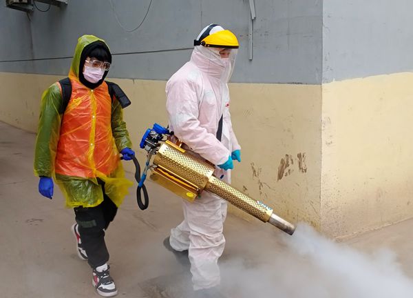 在山西省晋中市防疫执勤点,2018级信息工程学院任晓瑞同学正在给附近的街道消毒,从2月2日起,他便开始在社区志愿服务的岗位上坚守。他负责为市区和乡镇的学校、社区等防疫执勤点进行消毒。