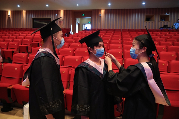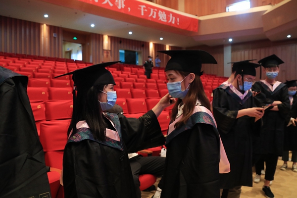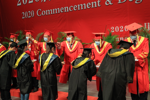 典礼结束后,2020届毕业生学位授予仪式举行。校领导班子成员为现场的200位毕业生代表进行了正冠拨苏、颁发学位证书并合影留念。据悉,我校今年共有4172人被授予学士学位,其中本部为2348人,求真学院1824人。61人被授予硕士学位。
