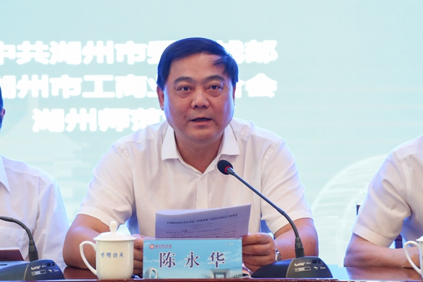 陈永华代表学校向一直以来关心支持学校发展的领导和企业家朋友表示衷心的感谢!他表示,师院作为湖州唯一一所本科高校,始终坚持“因地制宜、体现特色、服务地方”,积极助力湖州赶超发展。目前,已与三县两区及南太湖新区签订了新一轮战略合作协议,与相关局委、重点乡镇、龙头企业签订了项目合作协议,与18家企业共建研发中心、研究所,建立市厅级以上科技创新服务平台25个,承担市地校合作重点项目292项,组建了20支重点服务地方团队开展精准服务。