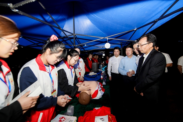 夏坚定一行来到应急救护学院展台前,驻足观看同学们CPR展示,并与同学们亲切交谈,询问了解了应急救护学院的情况,并强调急救是挽救人们生命的第一道防线。我校应急救护学院的大学生志愿者讲师向他们演示了CPR的整个流程。