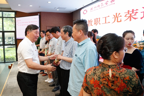 蒋云良代表学校党政和全体师生为荣休教职工送上真挚的祝福和崇高的敬意。蒋云良指出,荣休教师是学校一笔无形和无价的宝贵财富。在学校的发展历程中,你们不仅是学校办学规模从小到大的见证者,是学校办学实力从弱到强的参与者,更是学校办学层次由低到高的推进者。每位荣休教职工为创建大学贡献了自己的力量和无限的智慧。我们要坚持办好这一仪式,让荣休教职工有归属感,更要在校园里根植尊师重教的文化理念,让尊师重教的美德在湖师校园里一代一代传承下去。希望荣休教职工继续关心、关注、支持学校的各项工作,常回“家”看看,继续用智慧和热忱为学校发展建良言、献良策。