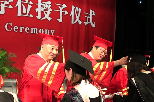 仪式上,校领导班子成员为毕业生们一一颁发了学位证书,正冠拨穗并合影留念。