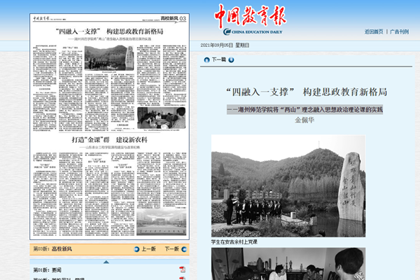 2021年9月5日,《中国教育报》03版发表了我校党委书记金佩华的署名文章——《“四融入一支撑” 构建思政教育新格局——湖州师范学院将“两山”理念融入思想政治理论课的实践》,全文如下: