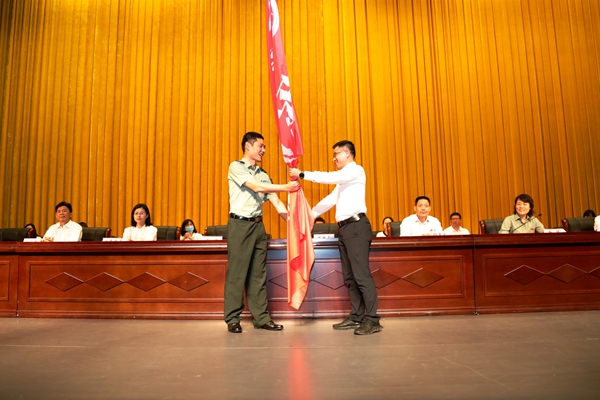 丁敢真向承训部队授旗,并宣布2020级学生军事训练正式开始。