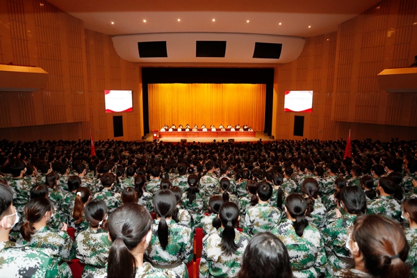 10月11日下午,我校2020级学生军训动员大会在东校区大会堂举行。校党委副书记丁敢真,副校长舒志定,中国人民解放军某部队军官、军训团团长夏厦出席会议。校军训工作领导小组成员、教导员和2300余名2020级本专科生参加此次军训动员大会。