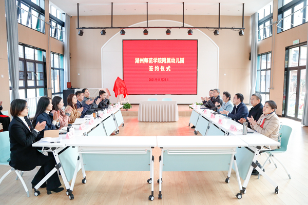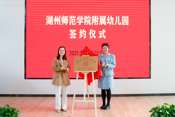 会上,我校教务处负责人与湖州市第三幼儿园祥和园区负责人签订合作协议。潘音、金斌斌共同为湖州师范学院附属祥和幼儿园揭牌。范慧敏向附属祥和幼儿园名誉园长颁发聘书。