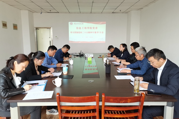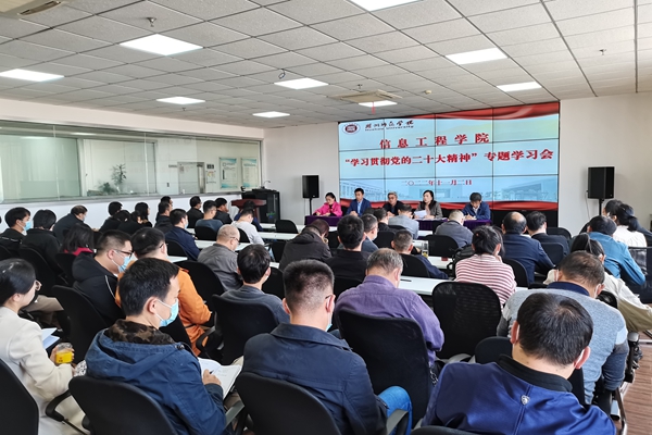 11月2日,信息工程学院召开专题学习会,传达学习党的二十大和二十届一中全会精神,并对宣传贯彻党的二十大精神做出安排。学院全体教师参加。会议强调,要把学习宣传贯彻党的二十大精神作为当前和今后一个时期的首要政治任务,在学院全体师生中掀起学习宣传贯彻热潮。学院将采取党委理论学习中心组学、支部集中学、党员研讨学等多种形式,引导每一位党员干部深入学习领会、准确理解把握党的二十大精神的丰富内涵和精神实质,促进党的二十大学习宣传贯彻各项工作全面铺开、走深走实。