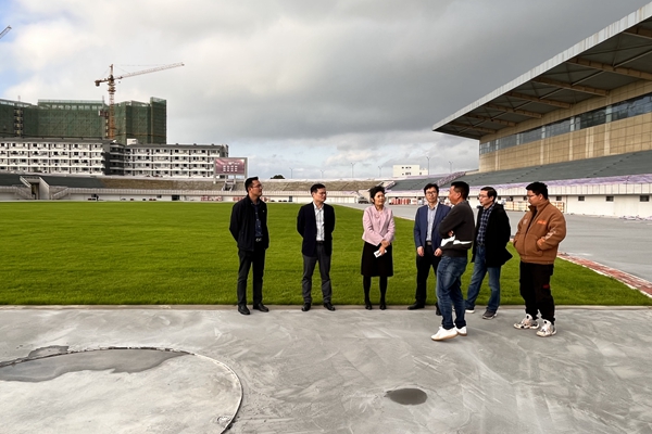 在运动场、风雨操场项目现场,潘音认真听取了施工单位负责人关于项目施工进度、质量管控、疫情防控、人员调度、原材料检测等方面的情况介绍,并就项目建设质量、进度和疫情防控等工作提出了相应的要求。