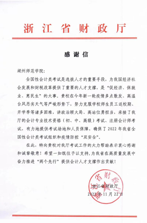 近日,浙江省财政厅向我校发来感谢信,感谢我校对2022年会计专业技术资格(初、中、高级)、注册会计师考试工作的大力支持和精心组织。