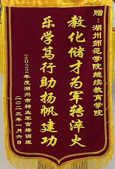 2023年新学期开学,继续教育学院收到了2022年全体转业军官送来的锦旗:教化储才为军转淬火,乐学笃行助扬帆建功。这是为期近三个月的转业军官培训班学员对学院培训工作的认可。