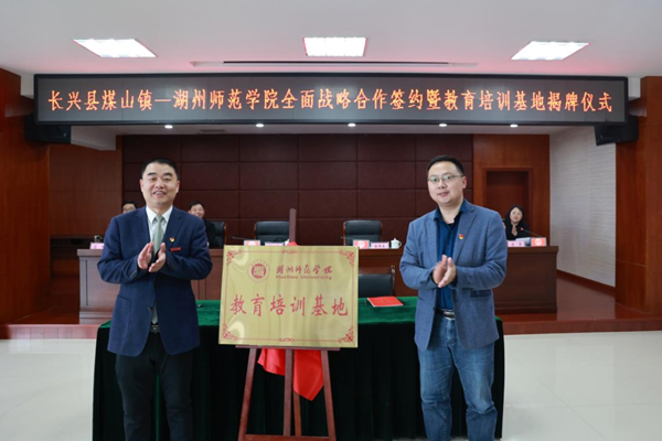 4月4日上午,我校与长兴县煤山镇举行全面战略合作签约暨教育培训基地揭牌仪式。长兴县煤山镇党委书记陆伟杰,长兴县委宣传部部务会议成员、社科联副主席马律,长兴县煤山镇党委委员方萍,我校社会合作处负责人,继续教育学院负责人,音乐学院特聘行业导师、长兴产学研基地负责人等相关负责人参加了仪式。