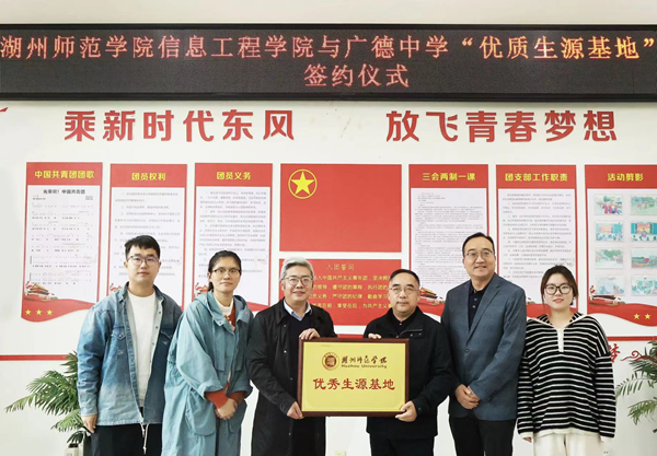 为积极应对招生形势新变化、切实精准提升生源质量,11月10日上午,信息工程学院负责人一行前往安徽省广德中学,进行“优秀生源基地”签约授牌。广德中学校长曾宪军、党委委员余恕斌出席此次仪式。