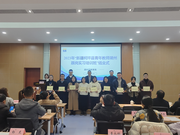 1月15日下午,由继续教育学院承办的2023年“新疆柯坪县青年教师湖州跟岗实习培训班”结业式在湖州市教师继续教育中心拉开帷幕。湖州市委教育工委专职副书记胡卫东,省援疆指挥部王兴宇,我校继续教育学院负责人,湖州市教育局、吴兴区教育局、新疆柯坪县教科局相关领导,市教师继续教育中心相关负责人,湖州二中、浙江工业大学附属德清高级中学、湖州四中、月河小学四所学校跟岗负责人及导师代表,新疆柯坪县在湖州跟岗学习全体教师等相关人员参加结业仪式。