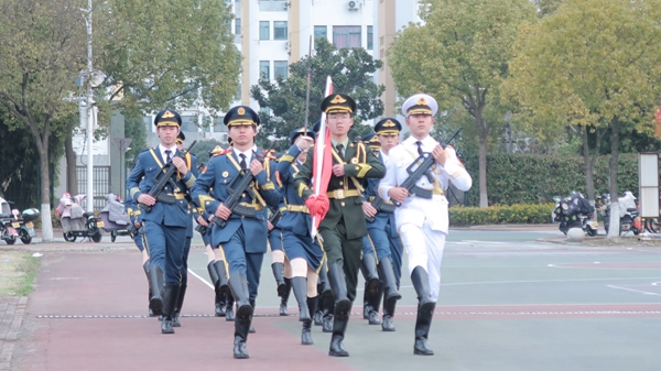 国旗护卫队迎着初升的晨曦,迈着铿锵整齐的步伐护送国旗走向升旗台,伴随着激昂嘹亮的《义勇军进行曲》,五星红旗在全体师生的注目礼中冉冉升起。