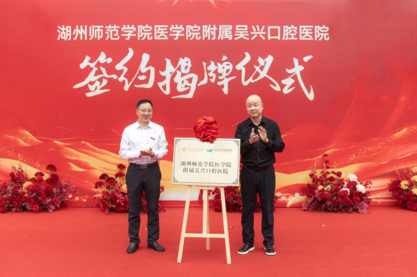仪式上,双方代表签署了合作协议书,并共同为湖州师范学院医学院附属吴兴口腔医院揭牌。